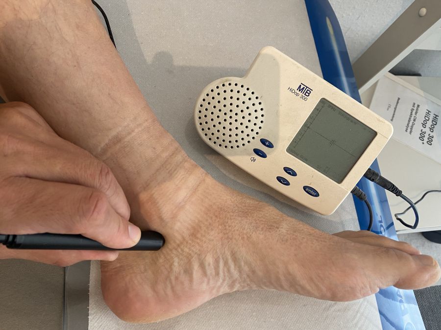 Bei der peripheren Doppleruntersuchung der arteriellen Blutgefäße mit der Stiftsonde am Unterschenkel/Fuss erhält man wertvolle Informationen zum Durchblutungsstatus. Dies ist insbesondere für die erstmalige Diagnose einer pAVK (periphere arterielle Verschlusskrankheit) wichtig. Überprüft werden die 3 wichtigsten Arterien für die Durchblutung des Fusses: A. dorsalis pedis, A. tibialis, A. fibularis).