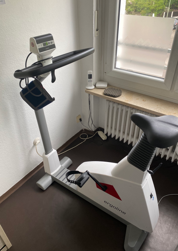 Ein Belastungs-EKG ist ein EKG, welches unter körperlicher Belastung durchgeführt wird - hierfür trainiert der Patient auf einem Fahrrad-Ergometer, während gleichzeitig ein EKG abgeleitet wird sowie der Blutdruck gemessen wird. Nach einer kurzen Ruhephase folgen sich steigernde Belastungsphasen von jeweils 2 Minuten Dauer. Die Steigerung der Belastungsphase erfolgt in 50 Watt-Schritten. Die Belastung wird von unserer Mitarbeiterin beendet bei körperlicher Erschöpfung oder bestimmten medizinischen Abbruchkriterien. Nach der Belastung wird noch eine kurze Phase der Erholung registriert. Die Durchführung des Belastungs-EKGs bedarf immer einer Terminplanung und wird bei uns ausschliesslich am Nachmittag durchgeführt. Die Untersuchung dauert ca. 20 Minuten.